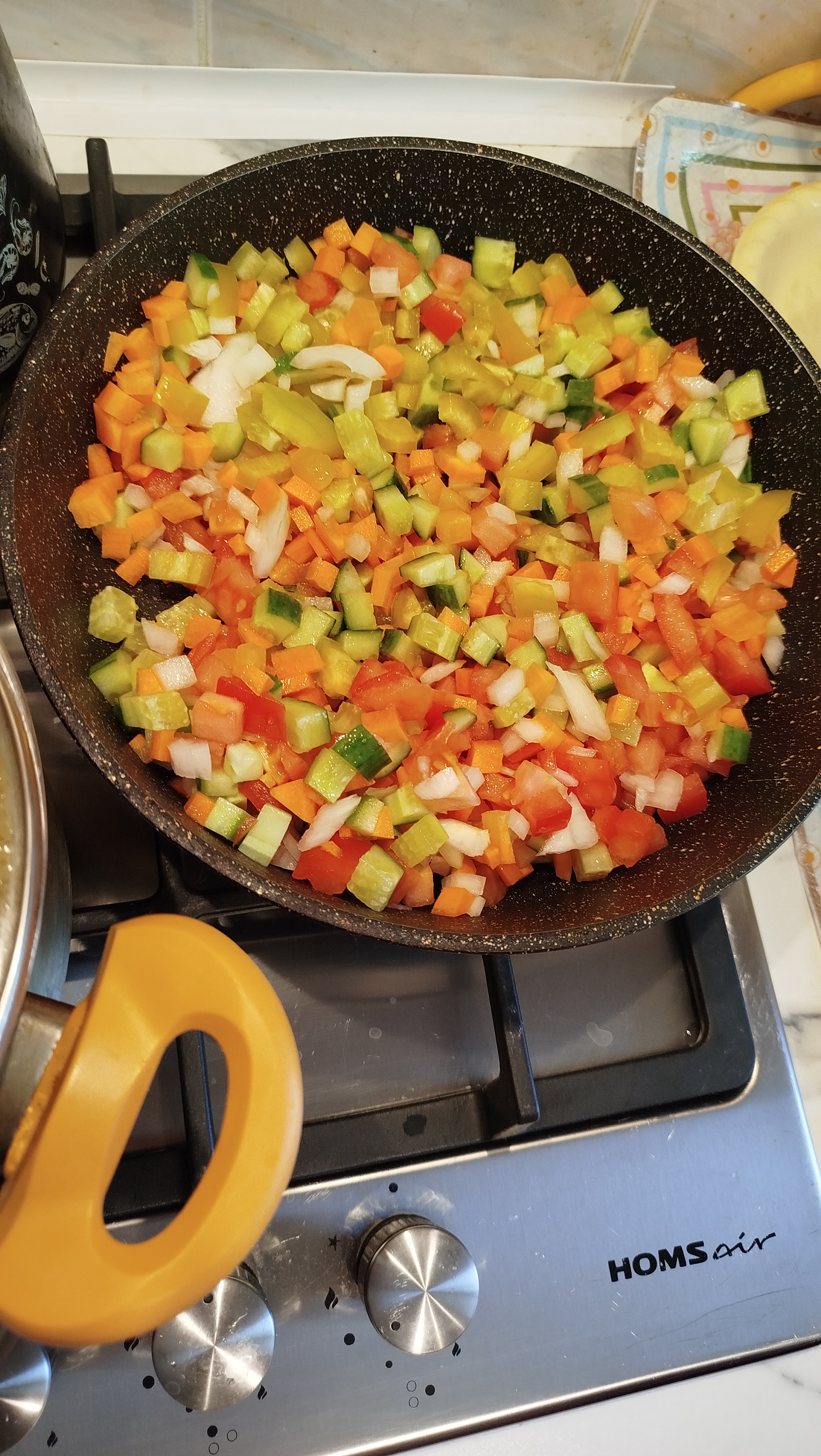 2. Тушение. Отправьте нарезанные овощи на сковороду, добавьте немного воды и тушите под крышкой около 30 минут на среднем огне, пока они не станут мягкими.